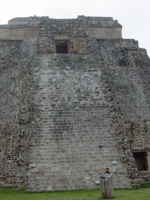 - Merida) Uxmal hatten wir ja bisher nur am Abend gesehen. Heute, nach dem Frühstück und vor der Weiterfahrt ging es dann noch mal zurück zur Anlage. Einen Teil des Eintritts hatten wir ja bereits am Vorabend mitbezahlt. So besichtigten wir nun die gut erhaltene Mayastadt Uxmal am Tag. Hier war natürlich mit der Ruhe, die wir im Süden erlebt hatten, vorbei und auch unsere Reisegruppen waren wieder da. Und ich konnte endlich meinen persönlichen Herr Koala Tempel finden :-). Am Eingang steht jedoch der Wahrsagertempel mit einer Höhe von 35 Metern. Dieser Tempel gibt mit seiner ovalen Plattform noch immer große Rätsel auf. Der Legende nach soll er in einer Nacht errichtet worden sein. Der Gouverneurspalast hingegen ist einer der typischen Darstellungen des Puuc-Stils. Uxmal dürfte mit seiner ersten Ansiedlung auf ca. 500 v. Chr. zurückgehen obwohl der Großteil der Bauten wohl zischen 600 und 1150 n. Chr. erbaut worden sein dürften. |