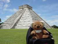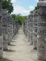 typischen Palmendachhütten, wie es sie heute noch gibt. Das imposanteste Gebäude ist das Schloss von Kukulkan. Es ist 30 Meter hoch und wurde wohl zwischen 650 und 800 n. Chr. erbaut. Die verschiedenen Zahlnummerierungen stimmen mit dem Sonnenkalender der Mayas überein. 91 Stufen x 4 Seiten = 364 plus die Plattform ergibt 365, also die Tage pro Jahr. Die 5 Verzierungen zu jeder Seite am Dach des Tempels sind 5 x 4 = 20, was die 20 Tage eines Monats im Mayakalender sind. Das Fantastische jedoch ist das enorme astronomische und mathematische Wissen der Maya, was an der Pyramide zum vollen Ausdruck gelangt. Jeweils zum Frühlingsanfang und Herbstbeginn ist die herabsteigende Schlange (Kukulkan) durch ein Licht und Schattenspiel zu sehen und ist die Hauptattraktion für viele Besucher. Auch die Akustik besticht, was vor allem die Amis eindrucksvoll durch wildes Klatschen vor der Pyramide demonstrieren.