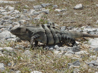 Blick auf das karibische Meer. Dort machte ich dann auch zunächst einmal Bekanntschaft mit den Leguanen, die dort überall auf dem Gelände herumliefen und scheinbar auch jede Hemmung vor Koalas (und Menschen) verloren haben. Natürlich schaute ich mir auch ausgiebig die Ruinen an. Leider konnte man aber nicht auf die Überreste hinaufklettern, die waren alle abgesperrt. Ist auch verständlich bei den Menschenmengen, die zu dieser Zeit das Gelände bevölkerten. Etwas dumm war auch, dass wir ausgerechnet am frühen Nachmittag dort waren als die Sonne am intensivsten war. Das brannte ganz schön auf dem Pelz und daraus sollten wir für die Zukunft lernen. Danach ging es wieder zurück nach Playa del Carmen. Dort angekommen zog es uns noch mal an den wunderbaren Strand wo wir uns im Meer etwas abkühlten und der Frank sich erst einmal ein kaltes XX Lager kommen ließ. Am Abend machten wir uns auf zur 5th Avenida. Das ist die "Hauptstraße" von Playa del Carmen, eine reine Fußgängerzone mit Geschäften aller Art, unausgelasteten Restaurants (vielleicht lag es auch einfach an der Jahreszeit) und dem üblichen Touri-Krims-Krams. Eines mussten wir hier feststellen: Mit den Händlern handeln scheint auf dieser Straße vergebens zu sein. Ob das wohl an den Amis liegt, die für jeden Mist jeden Preis bezahlen? Auf jeden Fall gilt diese Erkenntnis nicht für ganz Mexiko, denn später sollten wir noch andere Erfahrungen machen. Auch hier fanden wir ein nettes Restaurant in der ersten Etage gelegen, wo wir bei Live-Musik den Rest des Abends genießen konnten. |