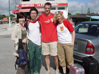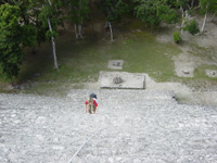 | 4. Tag (Chicanná - Campeche) Heute machten wir uns auf eine ca. 300 km lange Strecke aus unserem Urwaldhotel auf in Richtung Campeche, der Landeshauptstadt der gleichnamigen Provinz. Zunächst allerdings stellten wir fest, dass unser Hotel in Chicanná kein Telefon besaß, nicht einmal an der Rezeption. Zum Telefonieren (mit dem Handy) musste man auf einen Turm steigen um überhaupt Empfang zu bekommen. Uns störte das nicht weiter, aber das japanische Pärchen, das eine Rundreise mit dem Taxi machte, hatte zwar am Vortag kein Problem das Hotel zu erreichen, allerdings war das Problem an diesem Morgen ein Taxi zu bekommen. So nahmen wir sie ein Stückchen mit nach Xpuhil. Hierzu mussten wir etwa 15 km die Strecke vom Vortag zurückfahren, was allerdings kein Problem war, da wir ohnehin die Ausgrabungsstätten von Bekan, die wie Xpuhil und Chicanná in der Riu Bec Region liegen, besuchen wollten und zu diesem Zweck ohnehin zuerst in diese Richtung mussten. Unsere japanischen Freunde lieferten wir daraufhin an einem Taxistand in Xpuhil ab und, wie üblich bei Japanern, war erst einmal eine Fotosession angesagt. Hier wurden dann Jessica und Frank zusammen mit den Japanern von einem mexikanischen Taxifahrer fotografiert, was sich mit der japanischen Kamera unserer Mitfahrer wohl etwas schwer gestaltete und den Taxifahrer, zur Belustigung seiner Kollegen, vor einige Schwierigkeiten stellte. Daraufhin fuhren wir drei dann weiter nach Bekan. Auch hier mussten wir uns, wie Tags zuvor in Kohunlich, in eine Besucherliste eintragen. Und wen fanden wir da auf der Liste? Eben genau die beiden Japaner, die wir gerade mitgenommen hatten. Diese hatten nur 24 Stunden zuvor Bekan besucht und seit dem war auch kein anderer Besucher mehr dort gewesen. Natürlich kam auch keiner während wir uns auf der Anlage aufhielten. So konnten wir für uns alleine alles genau erkunden. Während der Frank mich auf die Pyramide hoch schleppte, gab Jessica etwas unterhalb des obersten Plateaus auf. War ganz schön steil und vor allem ganz schön hoch. Von dort oben hatte man aber einen super Blick über die gesamte Anlage und die Umgebung. Es wirkte schon fast irreal wie die Gebäudereste in der Landschaft standen. Eine tolle Leistung der Mayas und wirklich beeindruckend. Schön war auch, dass man wirklich alles erkunden konnte, in die noch vorhandenen Räume hineingehen konnte und somit der Besuch zu einem Erlebnis wurde. |